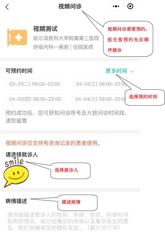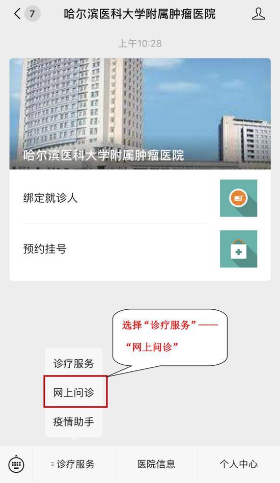 参与方式:微信搜索关注“哈尔滨医科大学附属肿瘤医院”微信公众号,点击“诊疗服务”中“网上问诊”,即可进入义诊平台,通过视频的方式与专家在线问诊(详细路径见下图)。